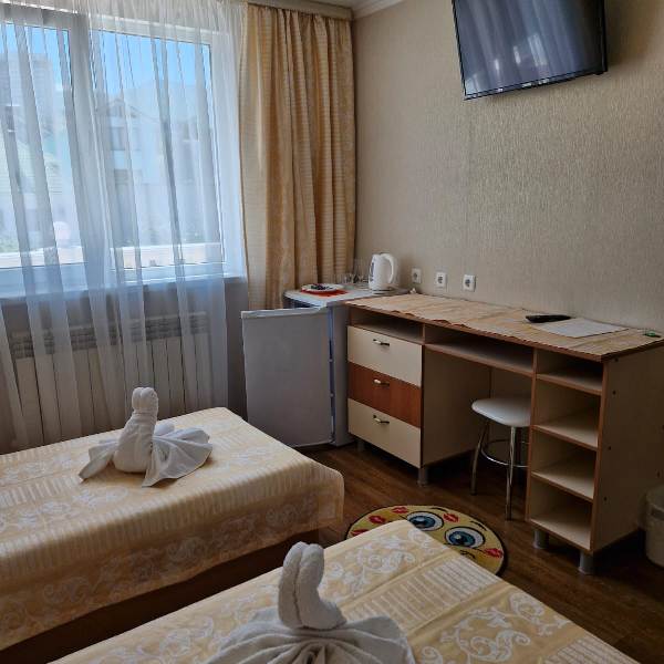 Балкон, стол, стулья, кровать семейная 180 см. шириной, санузел в номере (туалетные принадлежности личной гигиены, полотенца банное и лицевое),фен, телевизор, холодильник, кондиционер, чайник, постельное бельё.